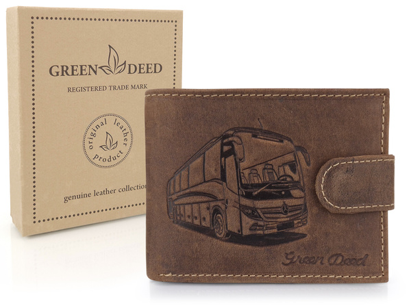 Klasyczny męski portfel skórzany z tłoczonym motywem autokaru.