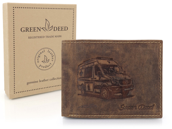 Klasyczny męski portfel skórzany z tłoczonym motywem ambulansu.