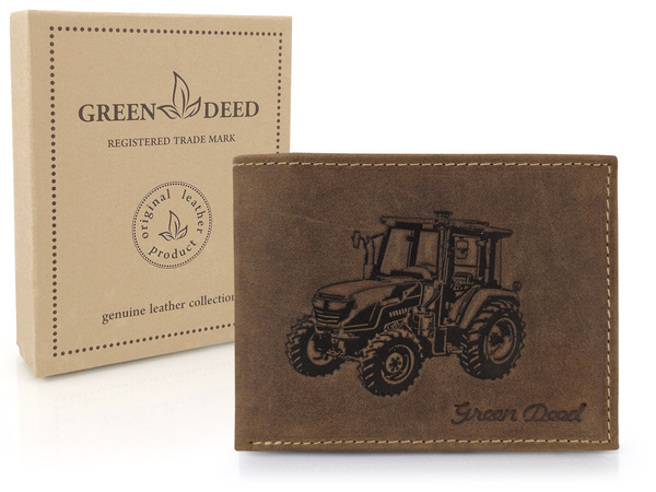 Klasyczny męski portfel skórzany z tłoczonym motywem ciągnika rolniczego.
